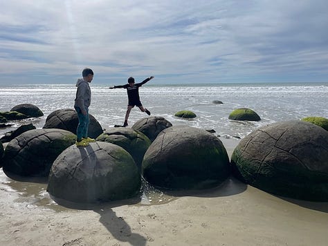 I knew all this, but the road trip was going so well, and the kids are getting older……we went down to the Moeraki Boulders. It was a bold move. Pun intended. But we watched the boys leap from rock to rock and for the first time ever visiting a beach we didn’t require a full change of clothes for the youngest flat mates. No story here. Look at us go.
